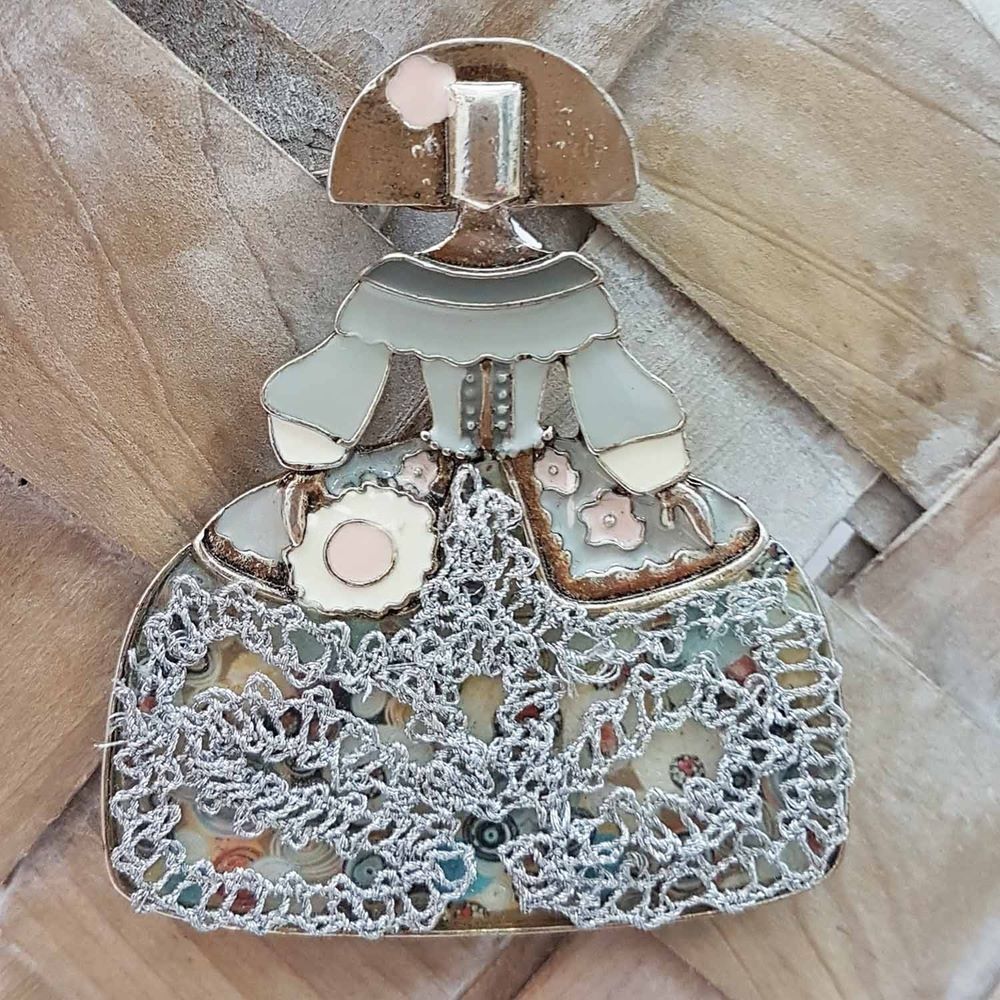 Broche Ménine métallisée avec un motif pour réaliser la jupe en dentelle aux fuseaux. Le fil métallique est recommandé pour sa réalisation.